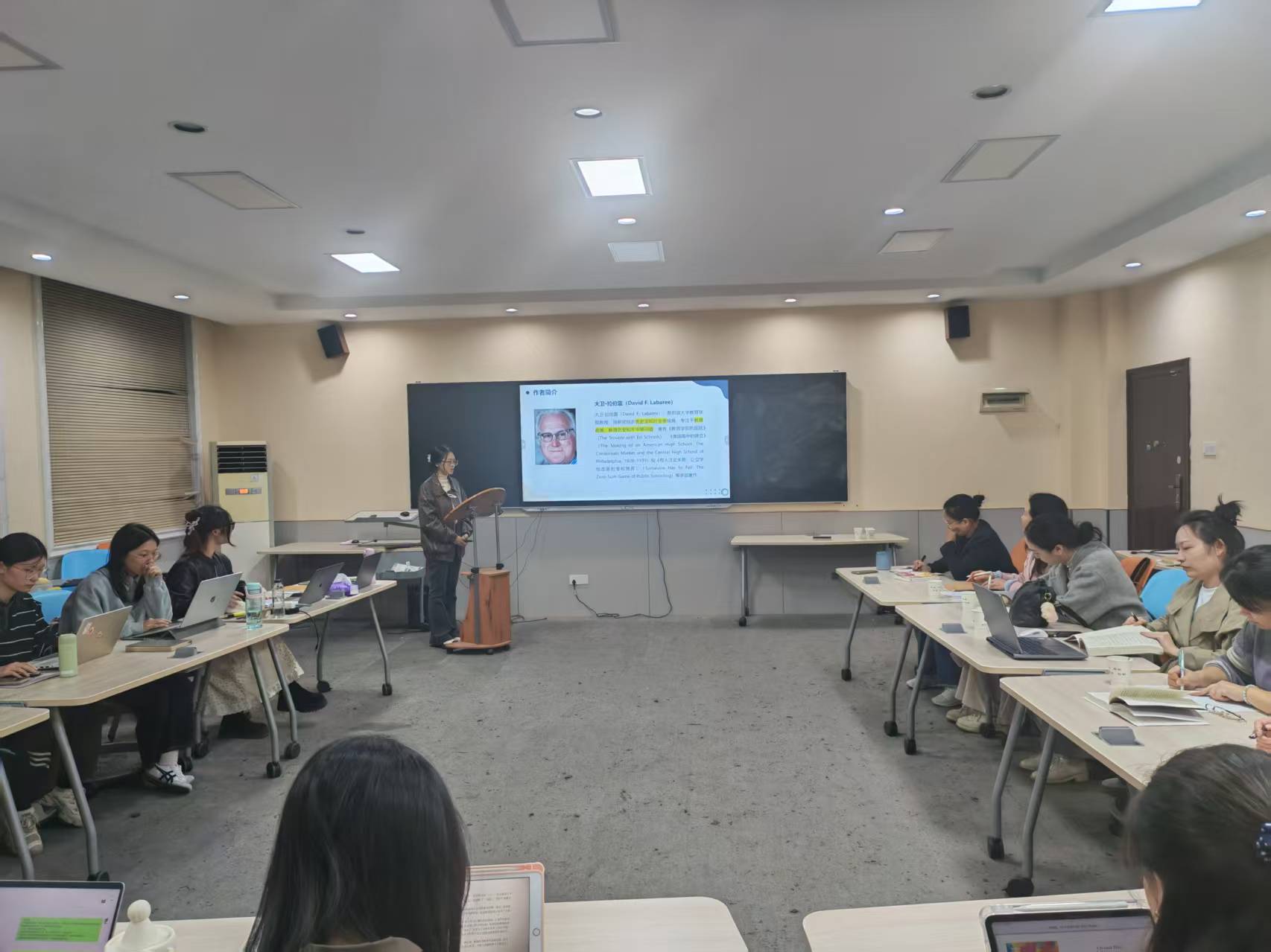 随后,郭丽君教授以“混乱”为切入点,深入解析了美国高等教育从19世纪无序状态跃升为全球典范的内在逻辑。她指出,其市场化的运作机制、层次分明的结构体系与多元化的社会支持网络,共同构筑了富有张力的发展生态,为我国职业教育优化类型定位、创新育人模式提供了重要参照。同时,她推荐《高等教育哲学》《高等教育系统——学术组织的跨国研究》与《美国大学小史》等经典著作,鼓励教师们广泛阅读、勤于思考,在多元视角中凝练教育智慧,提升对现代职教体系建设的整体把握能力。
